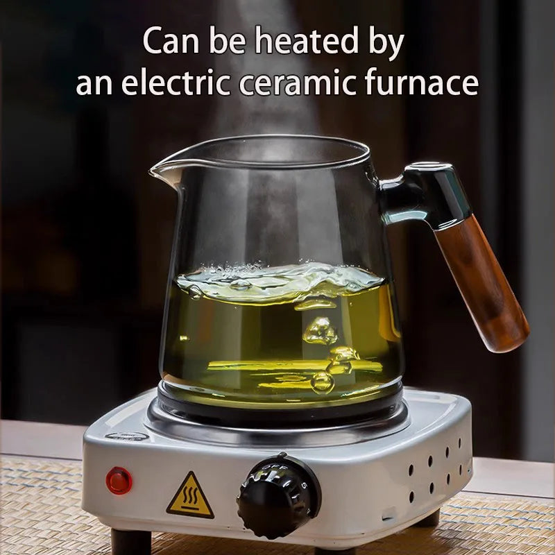 Glass Tea Kettle with Infuser Heat Resistant Teapot with Wooden Handle