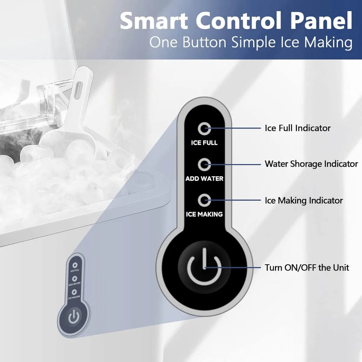 User-friendly - Equipped with a one-touch control panel. The large transparent lid allows you to monitor the ice-making process. The built-in infrared sensor automatically detects if the ice is full and stops production to prevent overflow. An indicator light comes on when the water is low or the ice basket is full. It also comes with a removable ice basket and ice scoop for easy transfer of ice to your beverage or ice bucket