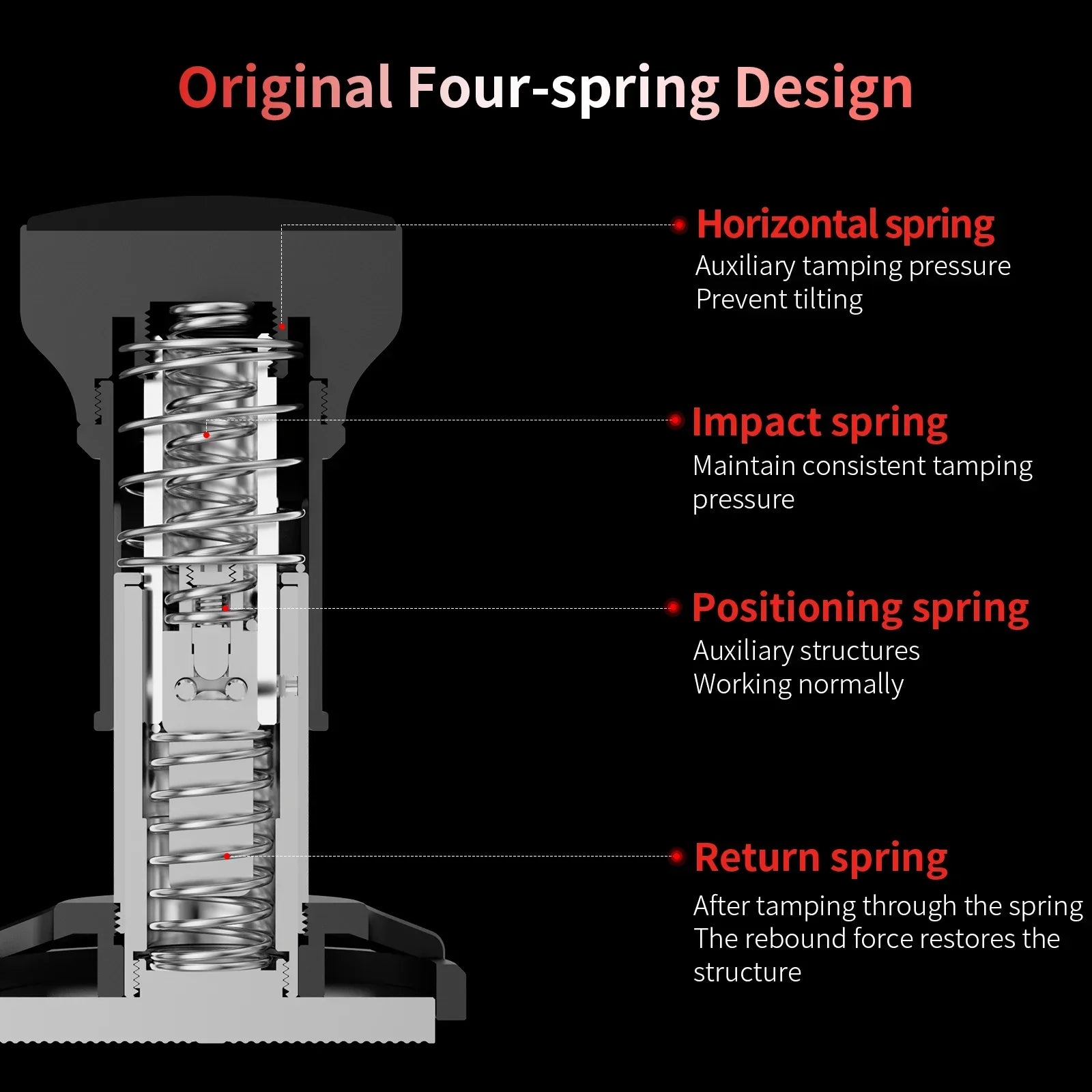 - Innovative 4-Spring Design: This state-of-the-art 58mm coffee tamper features a groundbreaking 4-spring system for precise tamping. Horizontal springs prevent tilting, impact springs maintain consistent pressure, positioning springs adapt to the required tamping height, and reset springs ensure accurate repositioning after each use.