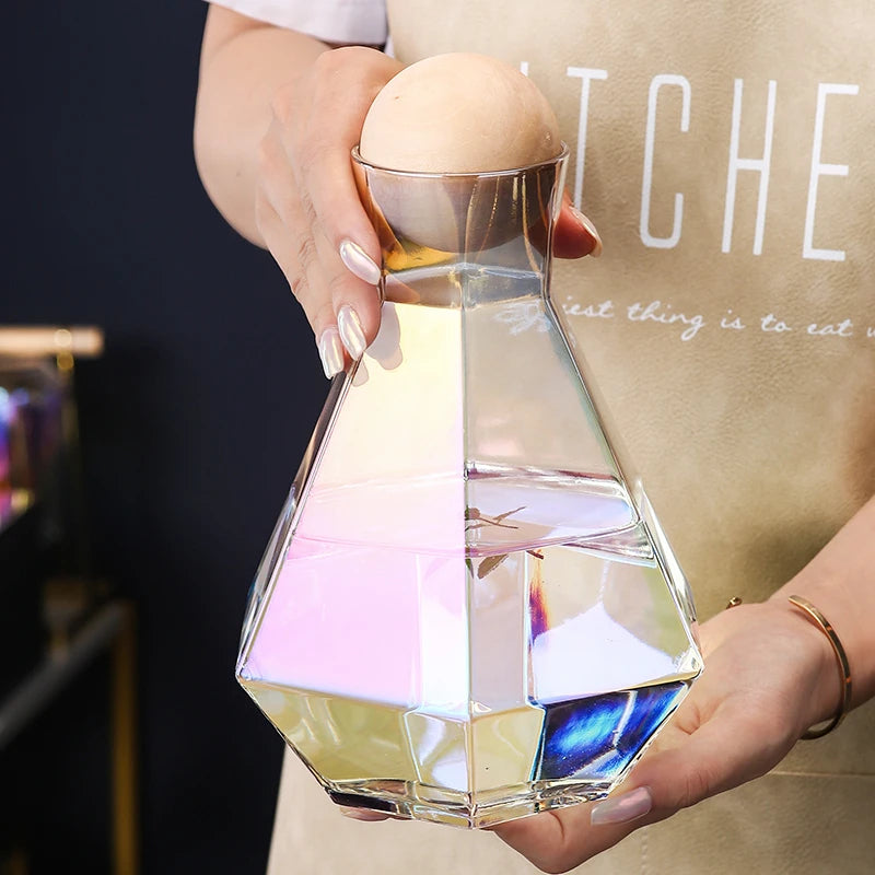 1*Nordic Prismatic Water Pots Glass Carafe Wooden Lid Decanter Glass