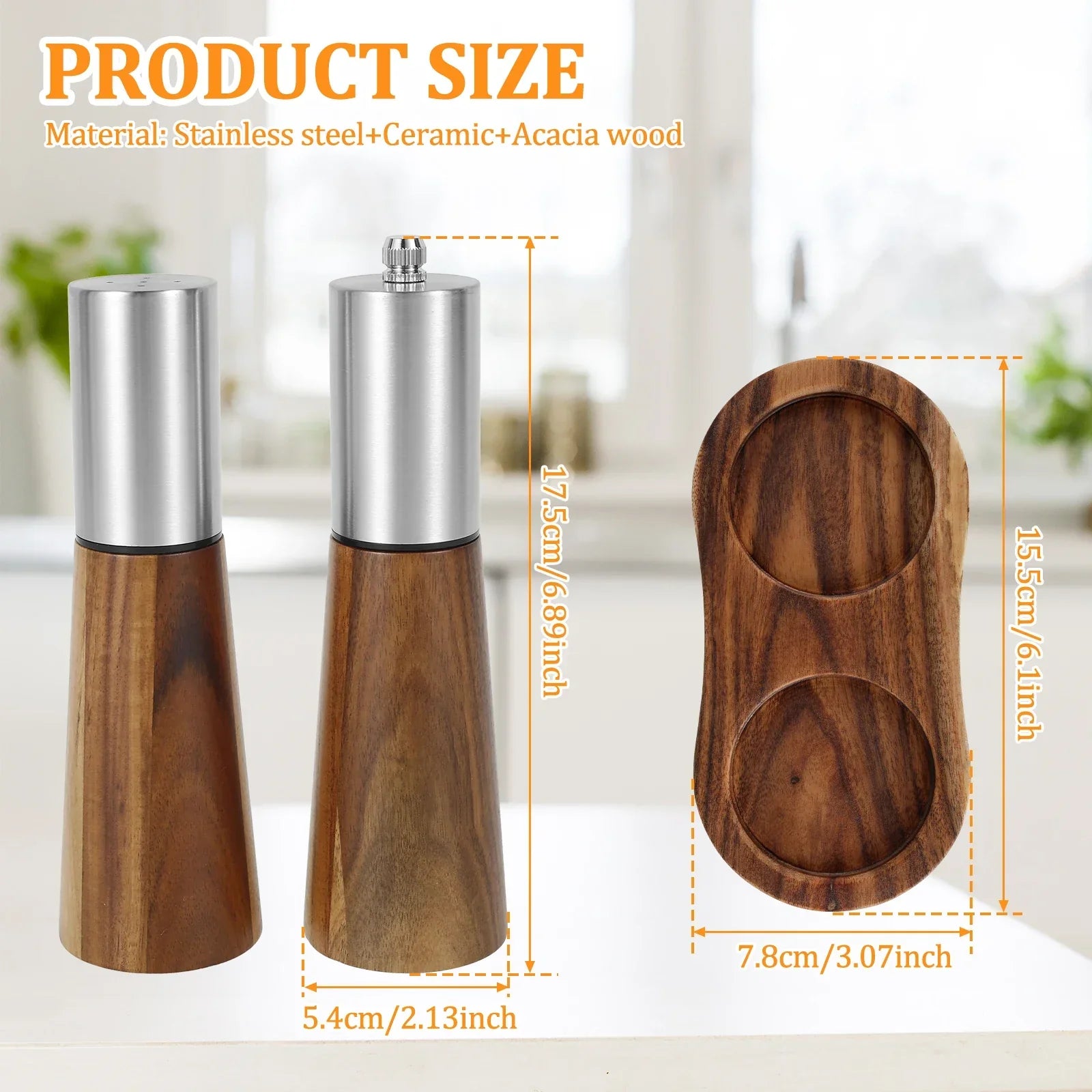 - Acacia Wood and With Tray: This salt shaker and pepper grinder set is made of solid acacia wood wood and it comes with a tray, adding a touch of elegance to your dining table or kitchen countertop.